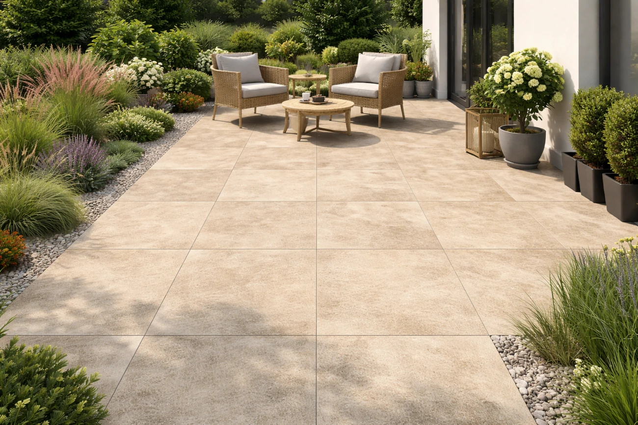 Glam Beige wyróżnia się stonowaną paletą odcieni beżu, które doskonale komponują się zarówno z zielenią roślin, jak i elementami architektury ogrodowej. To idealne rozwiązanie dla osób poszukujących eleganckiej, ale nienachalnej estetyki. Duży format 80×80 cm pozwala na tworzenie spójnych, przestronnych powierzchni, które optycznie powiększają przestrzeń i nadają jej uporządkowany wygląd.